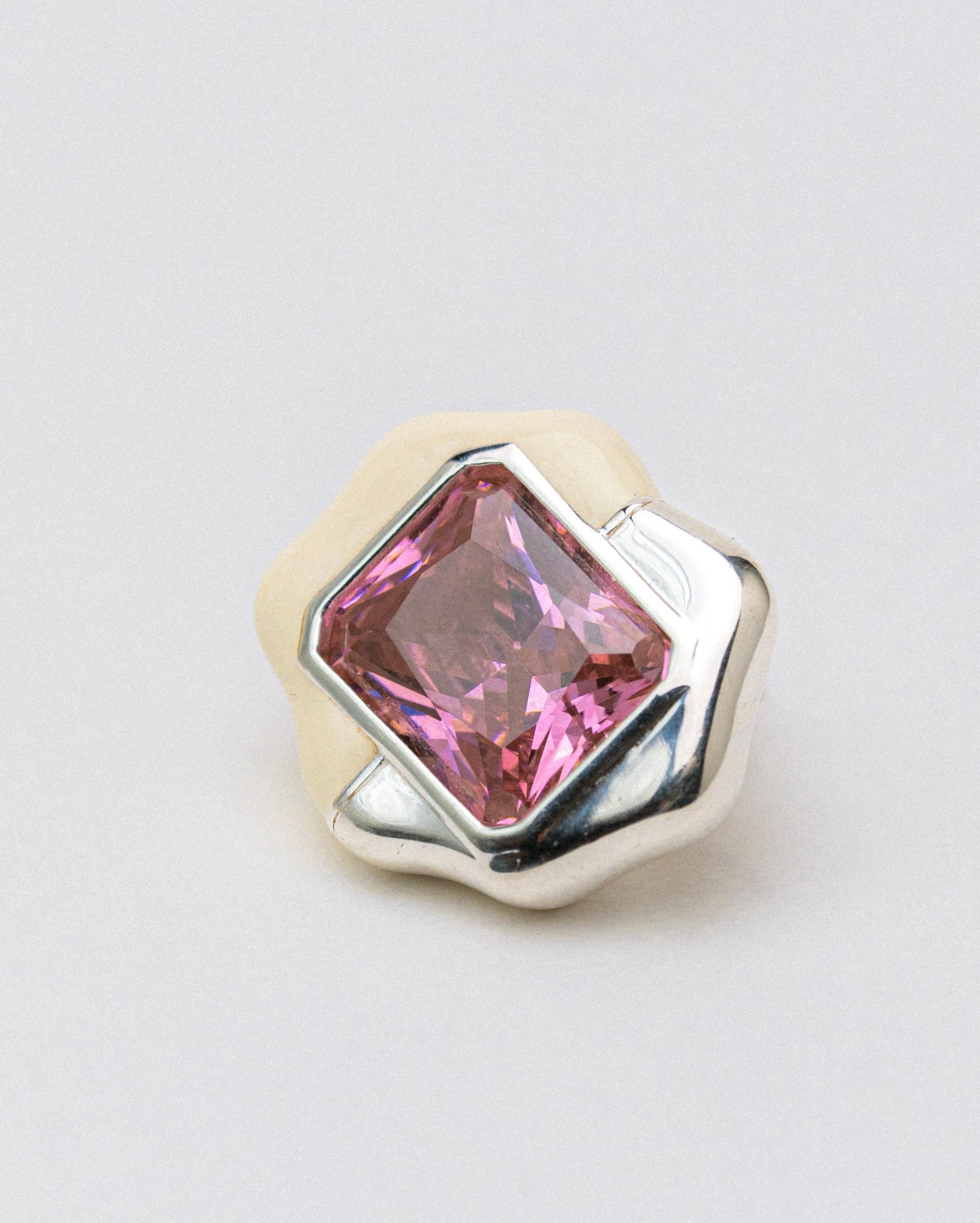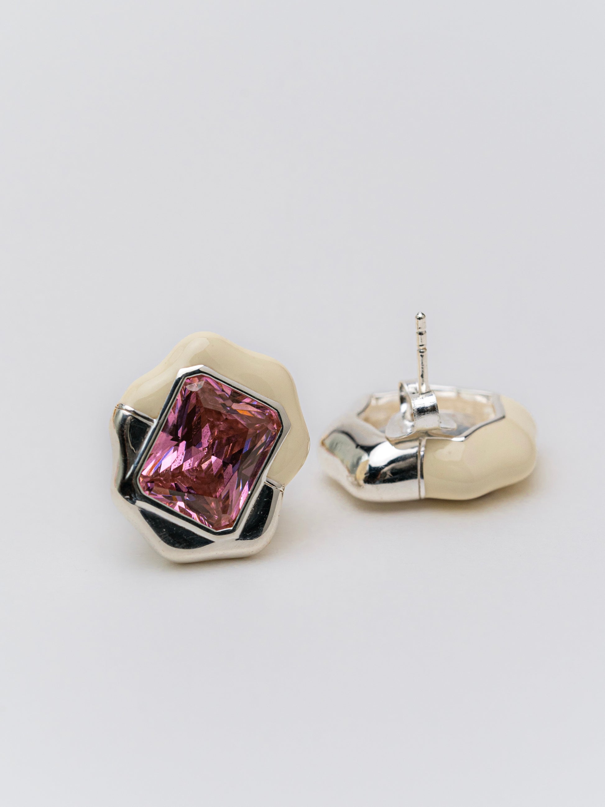 Made from 925 silver, these freeform studs feature a delicate cream-colored enamel dip and are adorned with a pink lab-grown cubic zirconia stone, creating a subtle yet striking contrast. The design is fluid and organic, giving it a sense of movement and uniqueness.